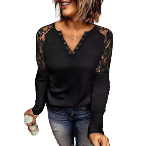 亚马逊春季新款蕾丝长袖上衣欧美女士修身V领纯色打底...