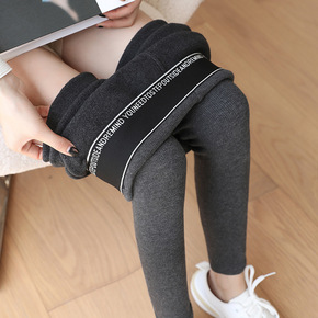 冬季新款字母腰棉竖条纹绵羊绒加厚显瘦一体打底裤女外...