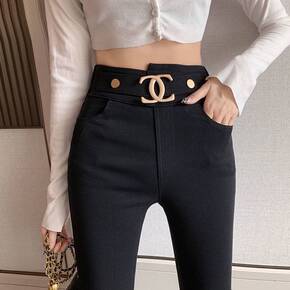 网红高腰弹力打底裤女秋冬新款外穿时尚潮金属扣加绒铅...