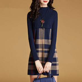 韩版女装立领气质针织格子长袖拼接A字裙2019秋冬...