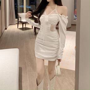 2021秋装韩版女装露肩女人味打底包臀裙子性感修身...