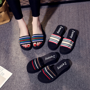 新款泡沫拖鞋女夏韩版个性时尚外穿厚底坡跟一字拖条纹...