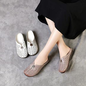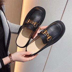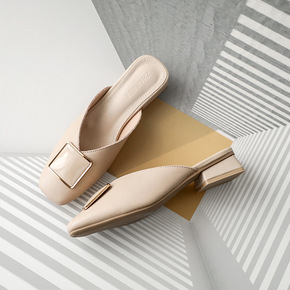 2022韩版时尚真皮包头半拖鞋女外穿粗跟方头凉拖新...