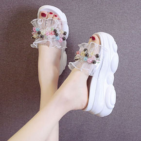 松糕底拖鞋网红坡跟拖鞋女夏季2021新款外穿水钻厚...