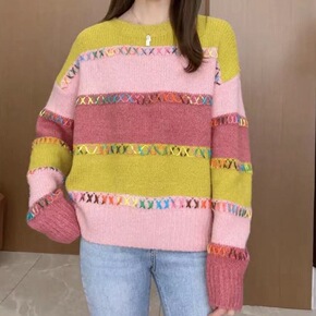 秋装新款彩虹条纹毛衣女慵懒风显瘦外穿针织套头衫学生...