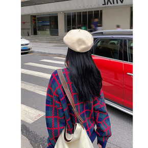 撞色菱格针织开衫外套女秋冬2021新款学院风短款毛...