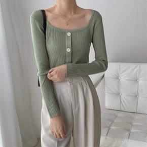 乐天6色 2021新款女装韩版方领针织衫坑条毛衣长...
