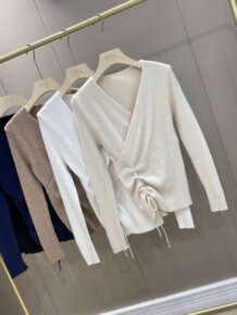 723修身纯色V领长袖设计感收腰针织衫女2021秋...