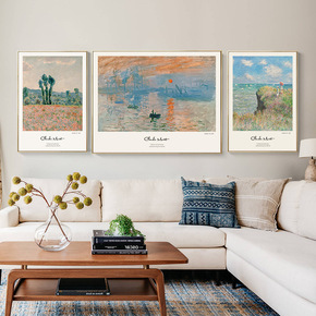 莫奈名画日出印象派油画现代简约客厅装饰画三联沙发背...