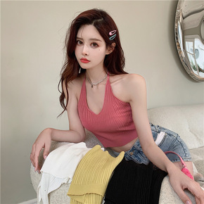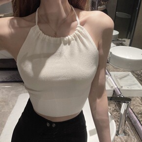 针织吊带背心短款2022春夏季新款挂脖式打底背心外...