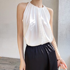 真丝挂脖吊带上衣女休闲宽松背心纯色缎面桑蚕丝百搭外...