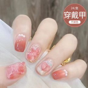 千行驹短款方圆网红同款指甲贴片 冰透裸粉珍珠穿戴美...