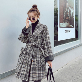 实拍ins大牌复古格纹西装领收腰系带显瘦小个子毛呢...