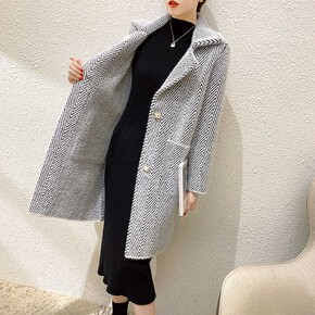 秋冬女中长款水貂绒大衣条纹流行毛呢加厚外套西装领洋...