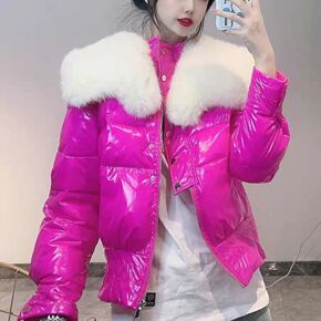 工厂直销2021冬季韩版糖果色大翻领毛毛领收腰亮面...