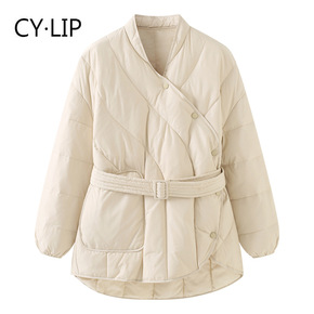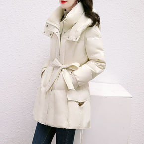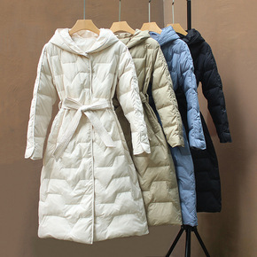 收腰羽绒服白鸭绒羽绒服女2021韩版简约腰带长款过...