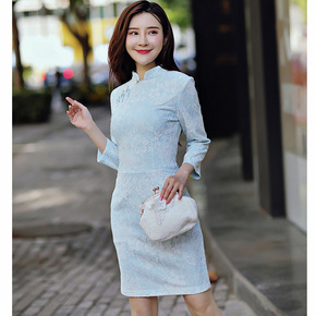 浅蓝唯美文艺盘扣唐装旗袍裙 改良时尚长袖修身蕾丝中...