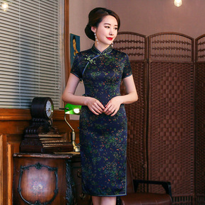 秋季2020新式长款七分袖 改良丝绸旗袍盘扣立领大...