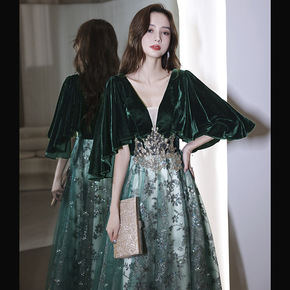 年会晚礼服女2021新款冬季宴会气质绿色艺考声乐长...