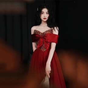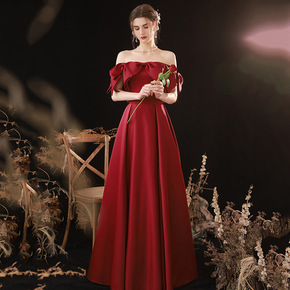 酒红色主持人一字肩模特走秀星空敬酒服森系年会轻奢1...