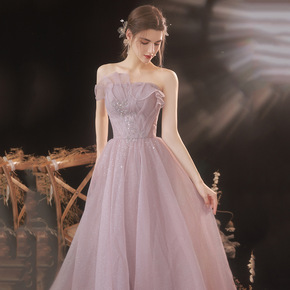 紫色主持人一字肩模特走秀星空敬酒服钉珠年会赫本风1...
