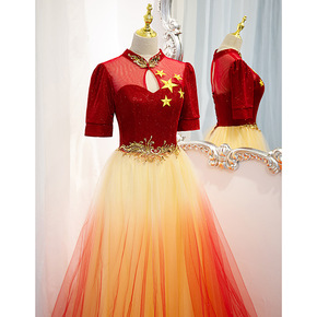 国庆演出服主持人礼服女2021新款晚会红色渐变色彩...