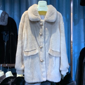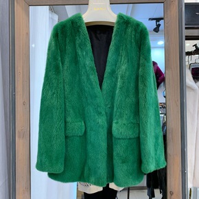 冬季天鹅绒裘皮宽松皮草外套水貂毛中长款v领小母貂整...