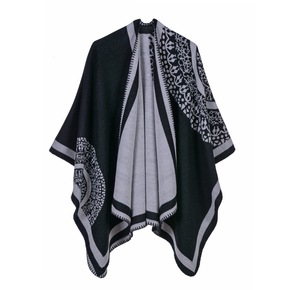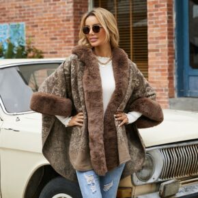 直播小欧美秋冬新款连帽披肩斗篷女仿狐狸毛领腰果图案...