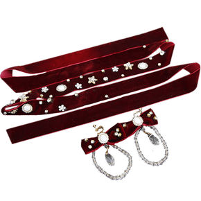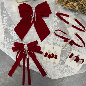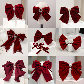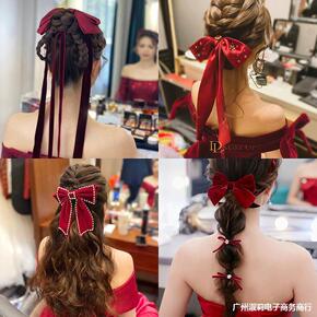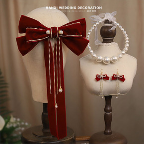 中式敬酒服头饰森系超仙美简约酒红色蝴蝶结发带结婚晚...