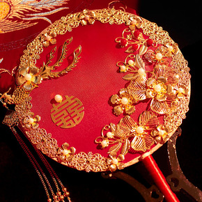 秀禾服新娘扇子2021新款红纱金色花边演出团扇结婚...