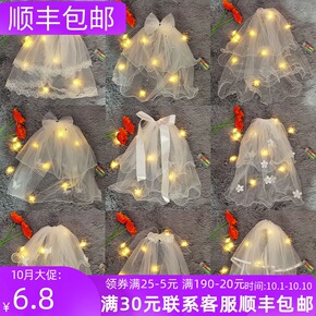 头纱带灯新娘头饰仙森系短款网红道具主婚纱领证简约复...