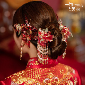 新娘头饰2020新款中式简约新娘秀禾服发饰红色流苏...