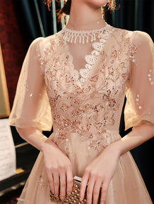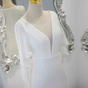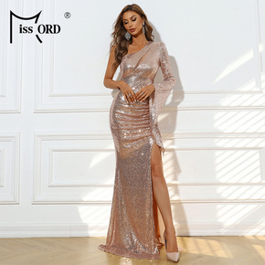 跨境外贸2021气质婚礼一字领单肩袖亮片开叉晚礼服...