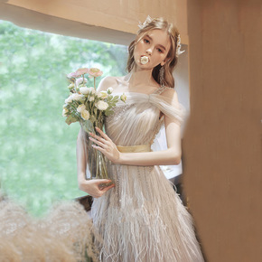 跨境亚马逊欧美吊带一字领婚礼优雅网纱高档中长款晚礼...