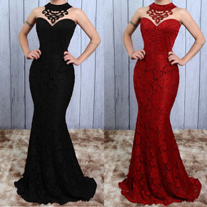 2019欧美外贸性感蕾丝透视礼服 wish圆领纯色...