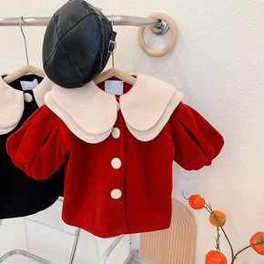 女童新年红花瓣领呢大衣2021冬季新款宝宝洋气节日...