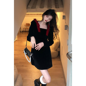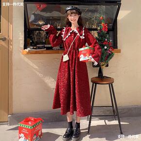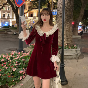 丝绒红色连衣裙子女装新年涤纶过年衣服本命年长裙秋冬...