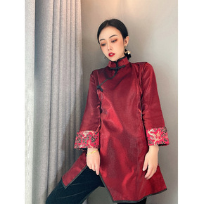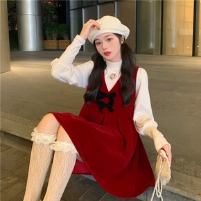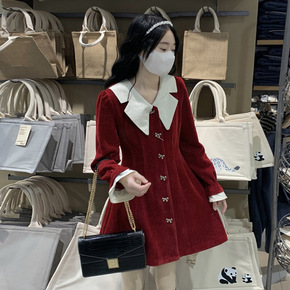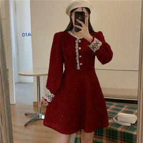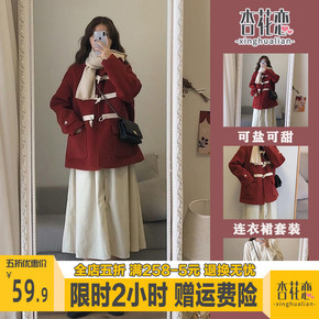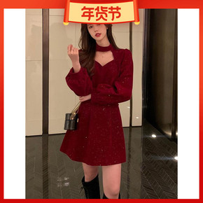 新年战袍过年衣服女装法式小香风别致红色连衣裙甜美套...