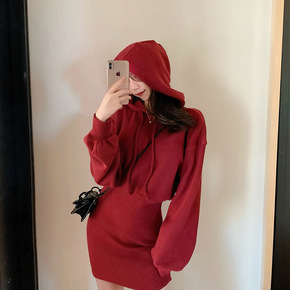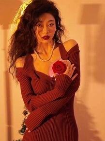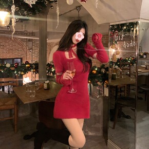 新年圣诞战袍红色针织法式纯欲连衣裙秋冬性感修身显瘦...
