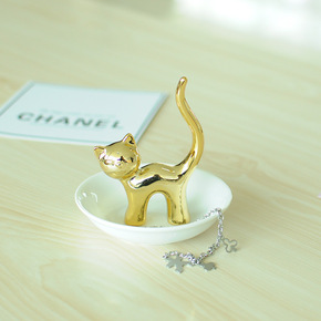 北欧风格 简约首饰收纳盘 金色陶瓷猫珠宝戒指托 首...
