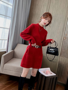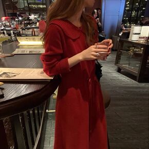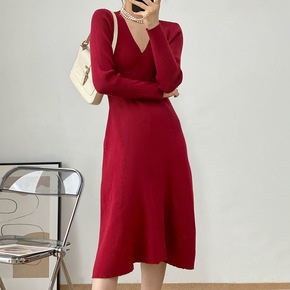 法式复古配大衣毛衣长裙新年战袍赫本风打底红色针织连...