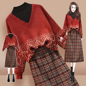 大码女装200斤胖妹妹春季套装女显瘦针织毛衣半身裙...