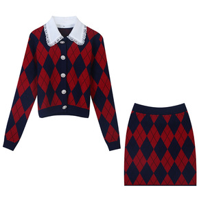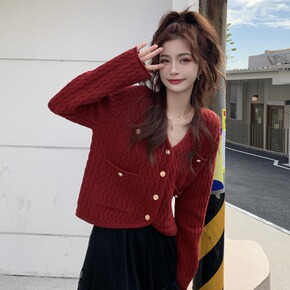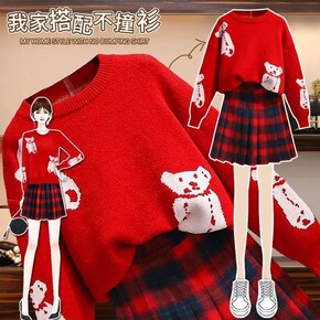 新年红色套装复古春季新款撞色蕾丝修身小个子针织毛衣...