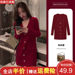 秋冬2022年本命年女装新款毛衣红色针织连衣裙子过...