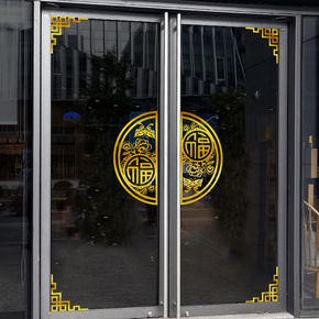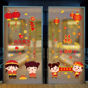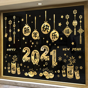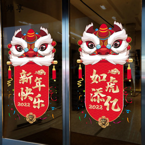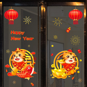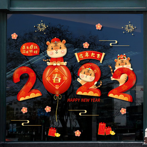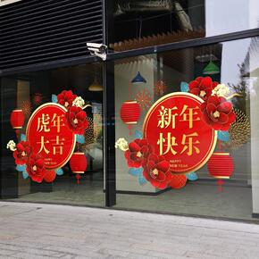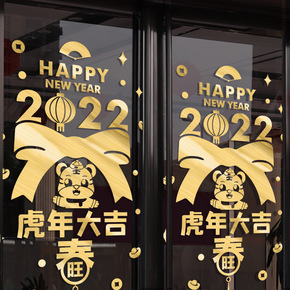 新年快乐玻璃门贴纸贴画过年装饰品布置2022虎年画...