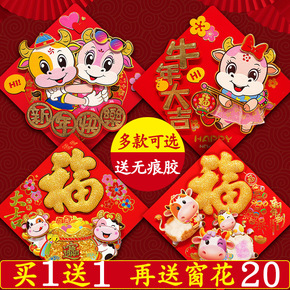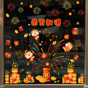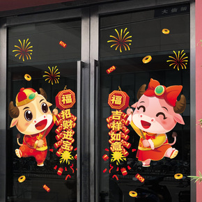 新年装饰鞭炮福袋玻璃窗花贴2021牛年春节橱窗贴画...