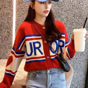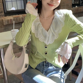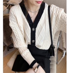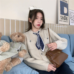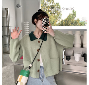 2022春秋新款韩版宽松短款法式复古翻领开衫毛衣拼...