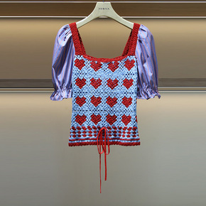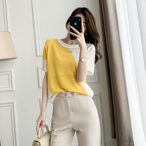 韩版冰丝针织衫女装夏季新款短袖T恤撞色宽松套头毛线...