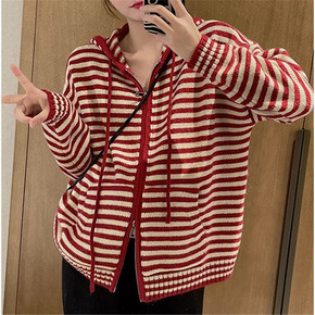 拉链连帽针织撞色条纹开衫女2022秋冬新款气质韩版...