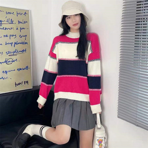 设计感小众复古撞色拼接毛衣女2022年春秋新款时尚...